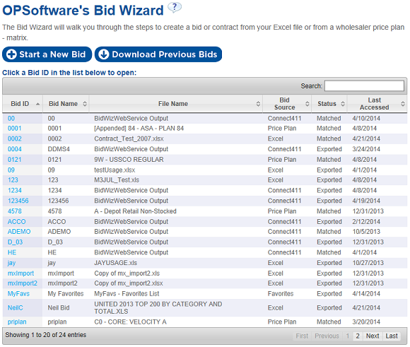 The Bid Wizard will walk you through the steps to create a bid or contract based on your Excel file, on a wholesaler price plan/matrix or on creating a favorites list.